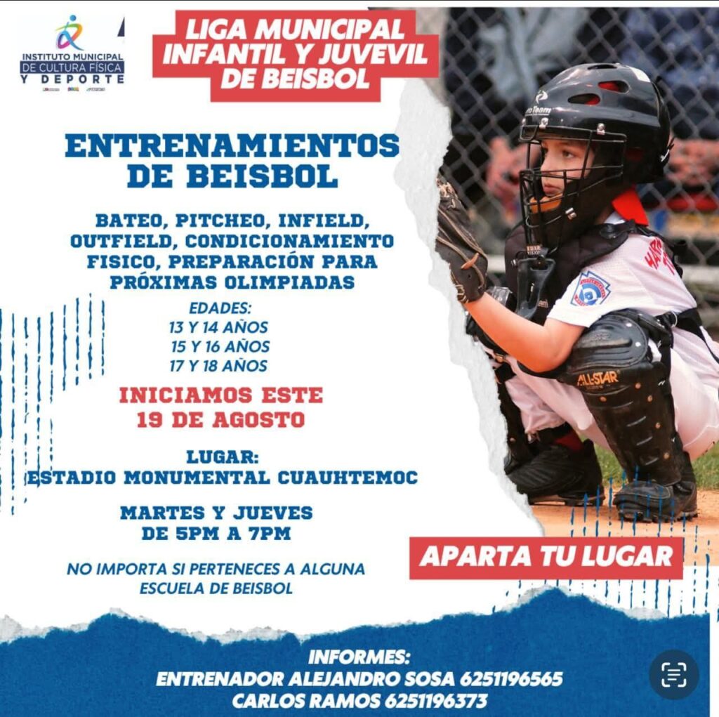 El Instituto Municipal de Cultura Física y Deporte, a través de la Liga Municipal Infantil y Juvenil de Béisbol, invita a todos los jóvenes apasionados por el rey de los deportes a formar parte de sus entrenamientos especializados, donde se forjan futuros campeones. 💪🔥